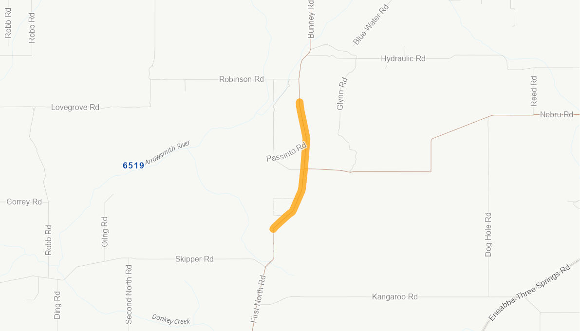 Gravel sheeting has worn away to natural sand subgrade. Vegetation clearing.