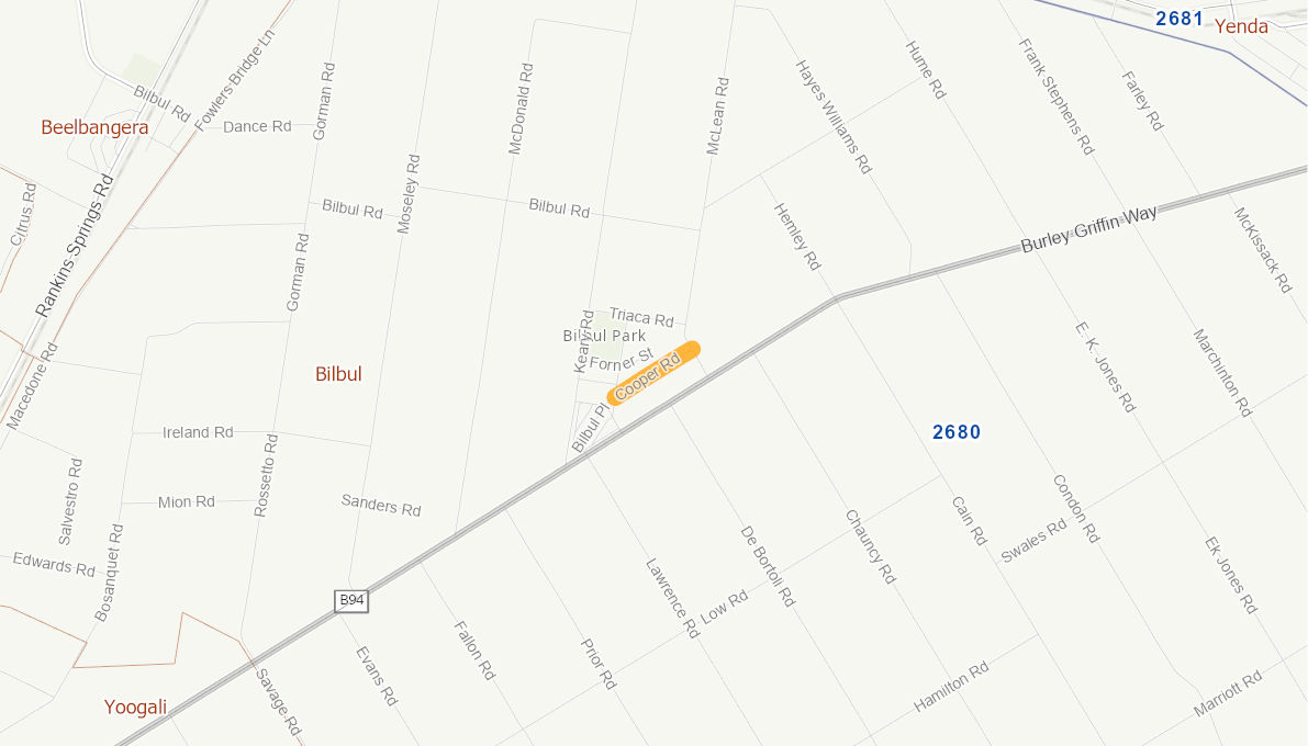 Construct and seal Cooper Road between Ferguson Road and Bilbul Road for a length o 0.616km. Cooper Road will be constructed to a formation width of 8.6m with a sealed width of 7.4m (2 x travel lanes each at 3.1m width and .6m sealed shoulders.