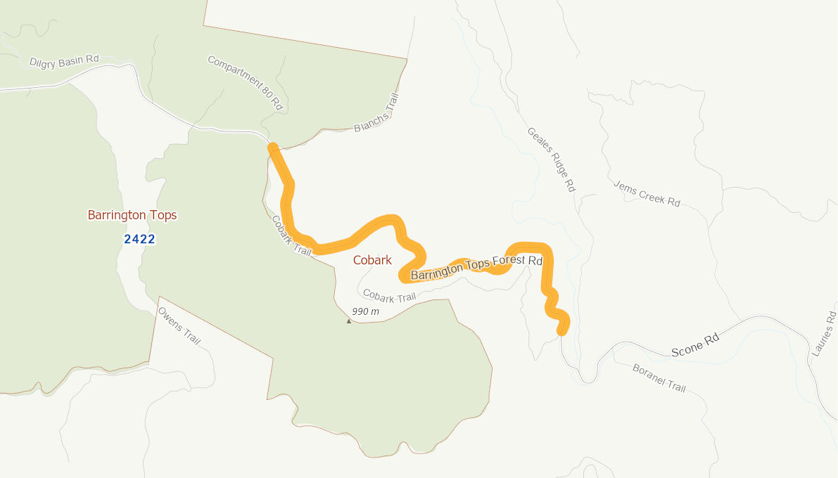 Scone Road is a well utilized inter regional tourist road, providing a direct link to Upper Hunter Shire Council and the World Heritage Barrington Tops National Park. Up to 1000 vehicle per day utilize this road. The current gravel section is narrow (generally less than 5m), often very rough and slippery in the wet. The school bus utilizes this route.