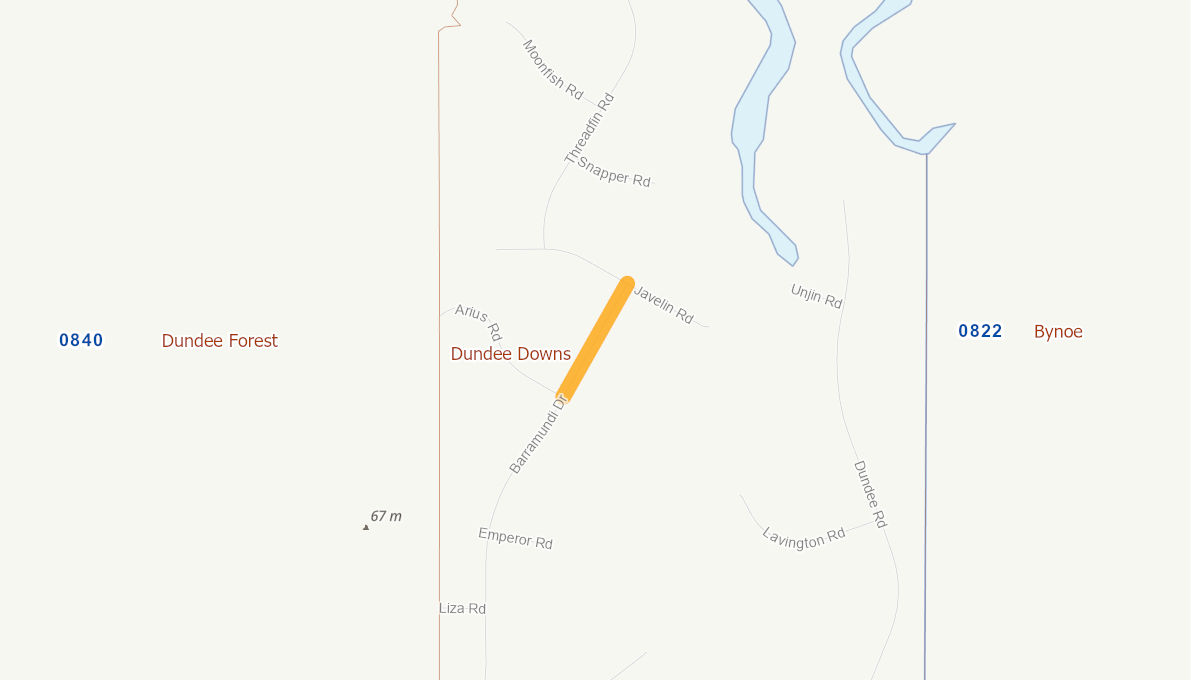 Barramundi Drive provides access to the Dundee Downs boat ramp that is very popular and significantly used by tourists and community for fishing and recreational purposes. Barramundi Drive is sealed up to Chainage 4.82 kilometres with remaining 1.15 kilometres unsealed to the intersection with Javelin Road. The unsealed section of Barramundi Drive becomes slippery during wet season and becomes hazardous for motorists with boat and trailers. Sealing of remaining unsealed section of Barramundi Drive will provide a better surface for motorists with boats and trailers.