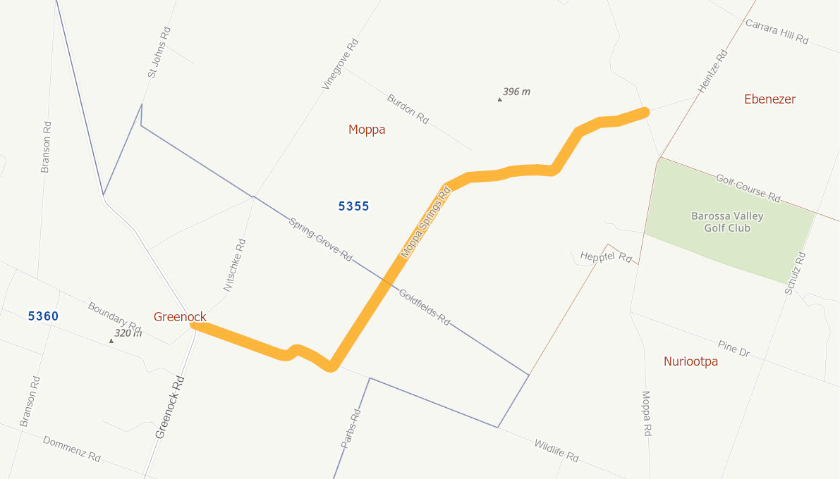 Moppa Springs Road is classifed as a category 2 within Council's road hierarchy and provides an unsealed link to residential and farming houses to the North of the town of Greenock. In recent times, the road condition has deteriated and is slippery when wet and dusty in the drier months. This causes motorists to continually change their driving patterns to adapt to the conditions.