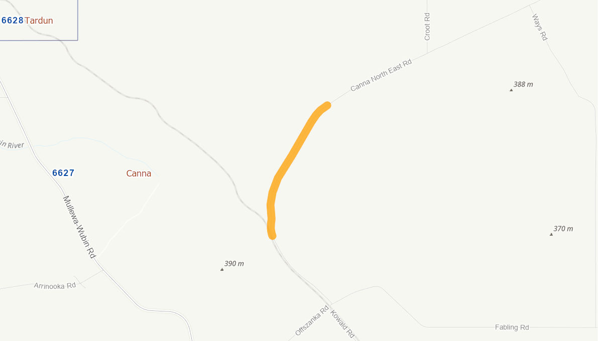 Clear verges to a width of 12 metres. Construct road formation to a width of 10 metres. Resurface with gravel 150 mm deep.