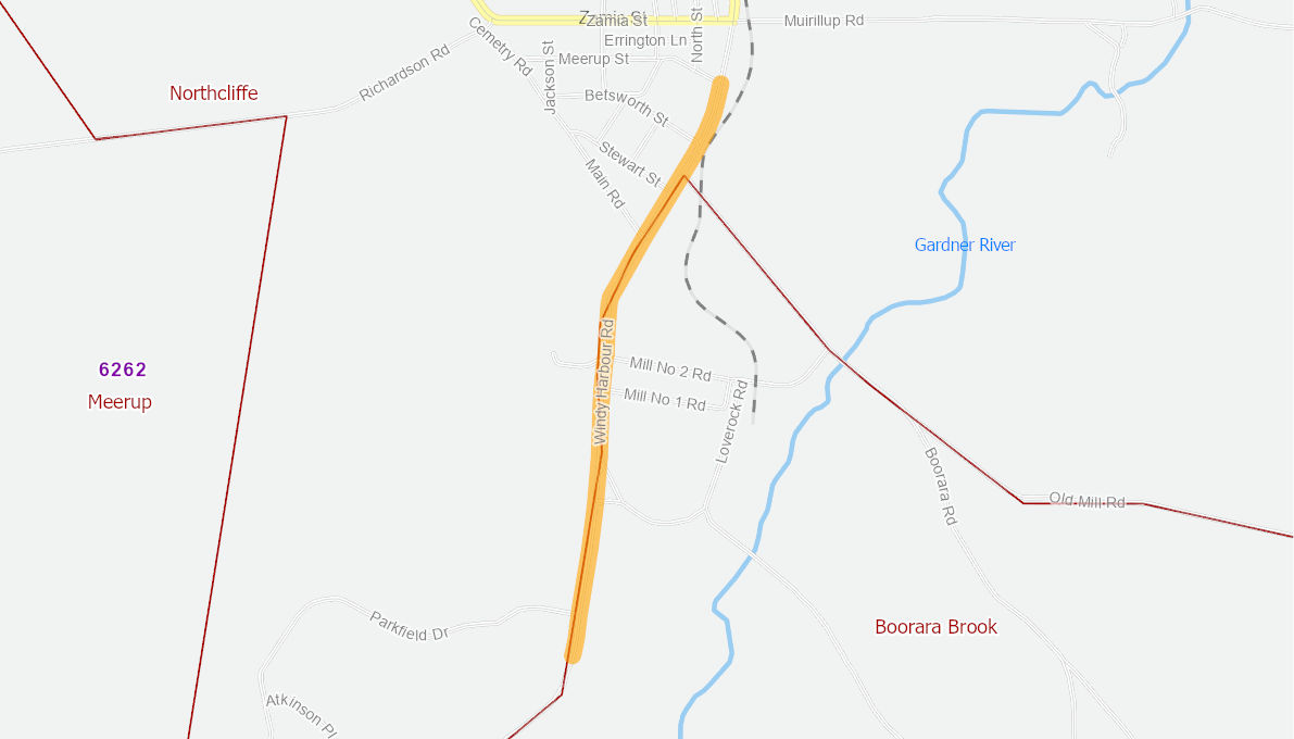 Between Meerup Road and Mill No. 1 Road, reconstruct the road with suitable gravel including boxing out areas where the sub-grade is substandard. Construct a 8 metre wide pavement and place a 6 metre wide spray seal. For 1000 metres south of Mill No. 1 Road place a second coat spray seal.